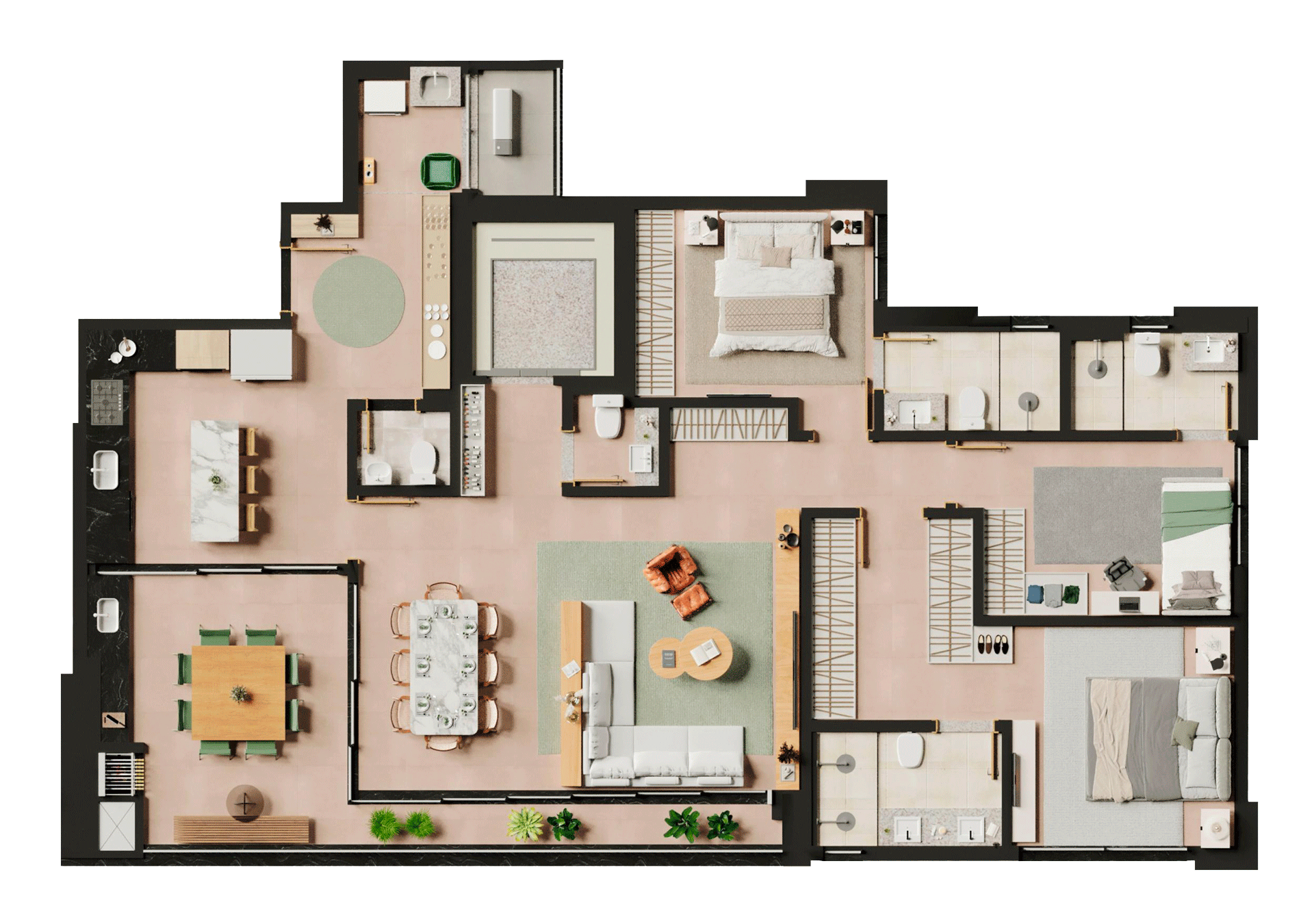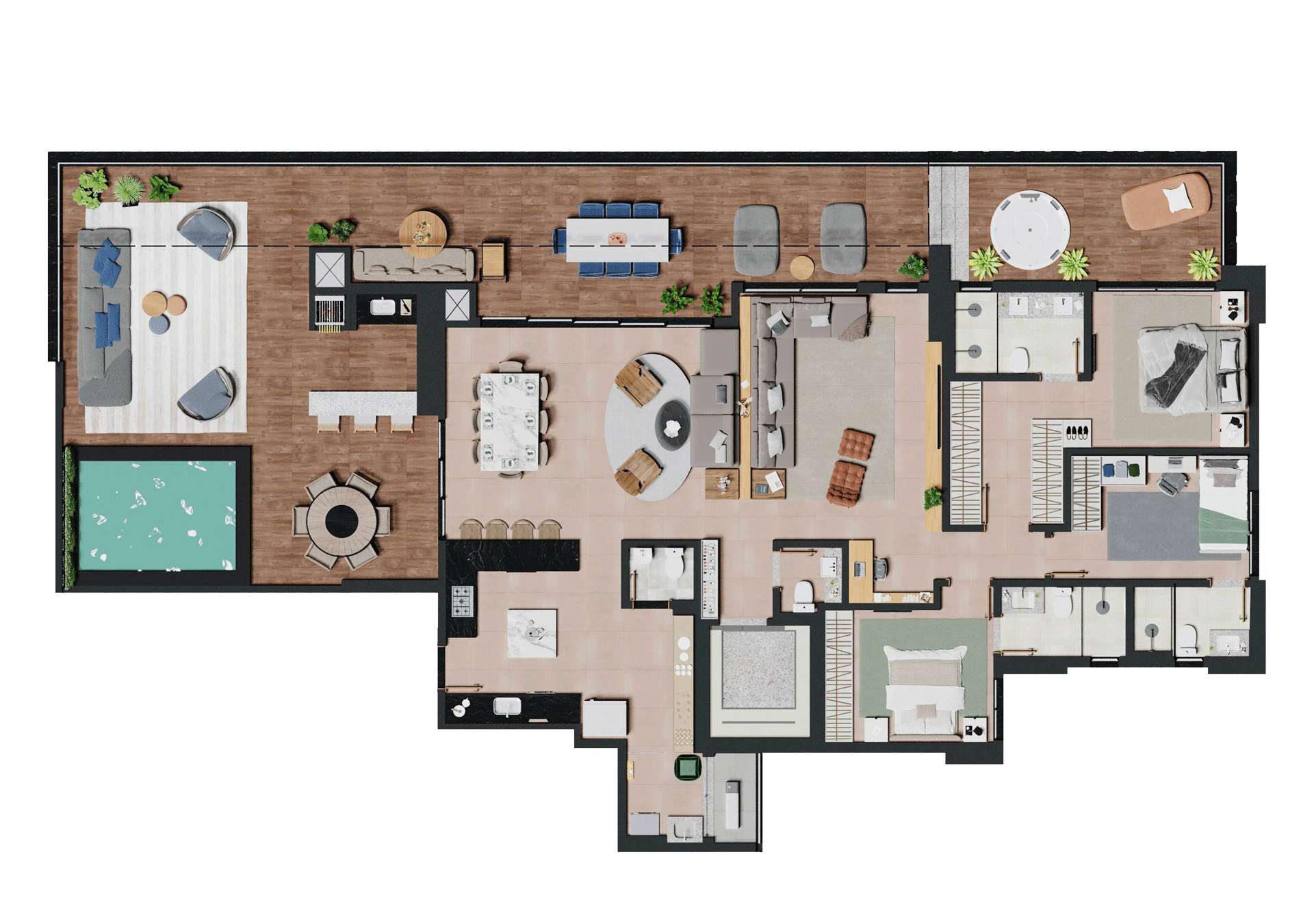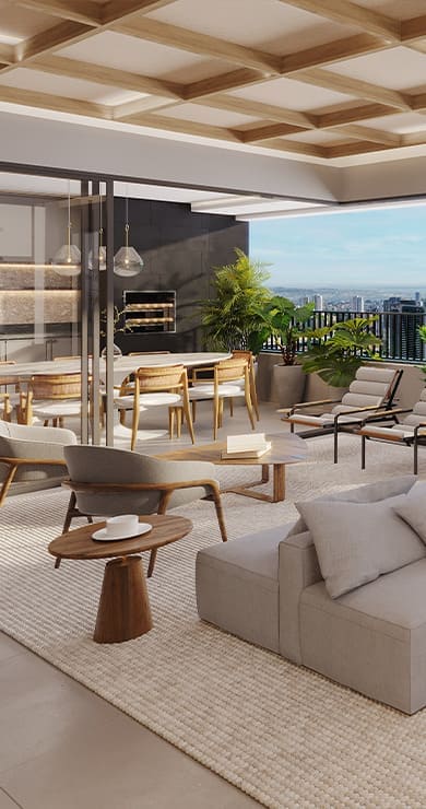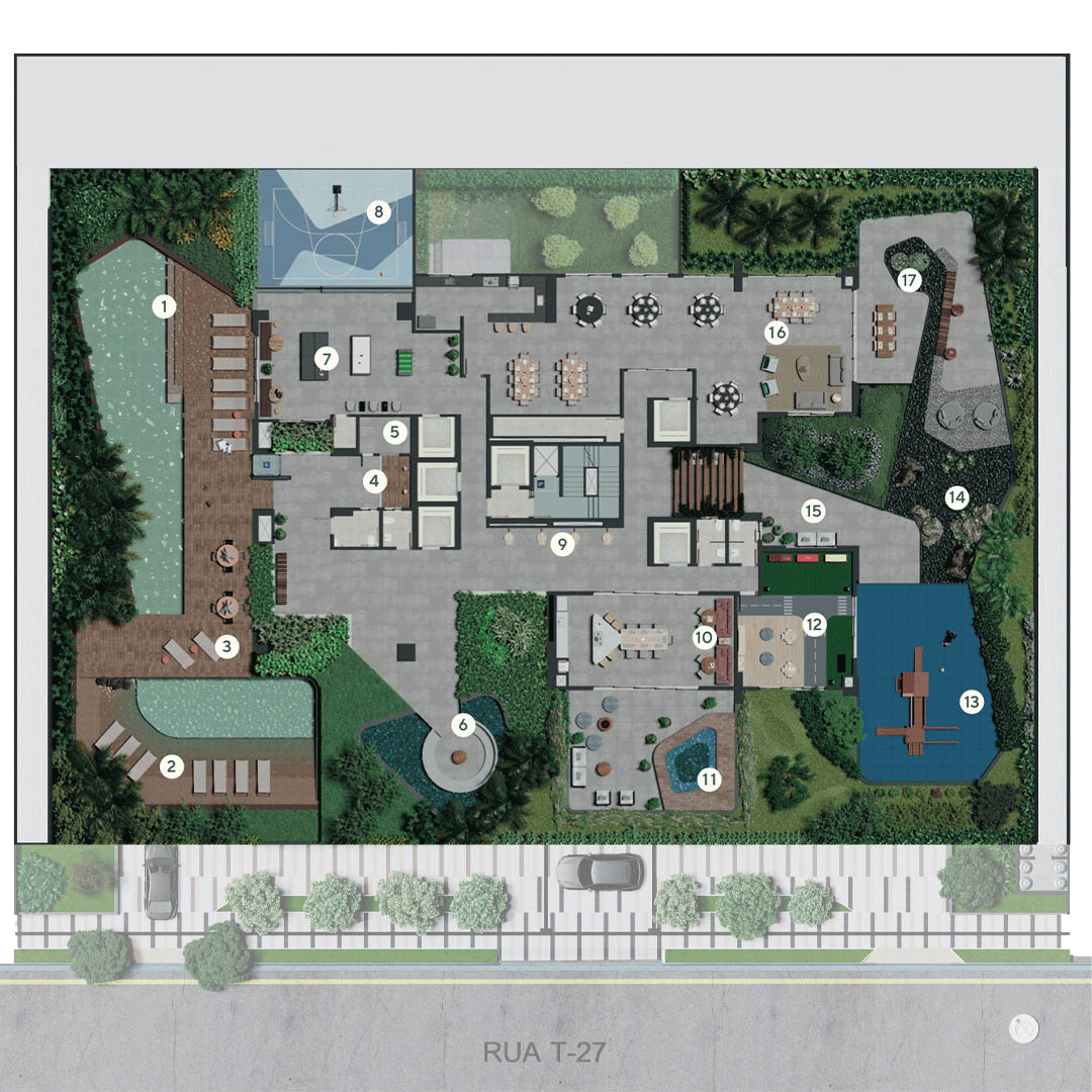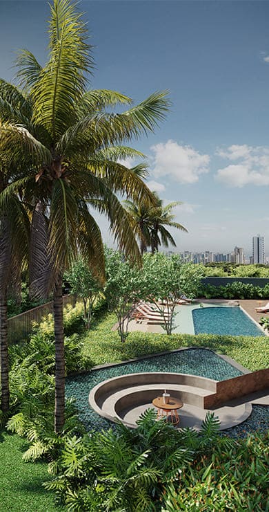 A ELEGÂNCIA NATURAL DO PAISAGISMO ASSINADO PELA CARDIM ARQUITETURA SE INTEGRA A DIVERSAS ÁREAS DO EMPREENDIMENTO E O CLIMA TROPICAL CRIA O CENÁRIO PERFEITO COM 800 M² DE ÁREA VERDE.