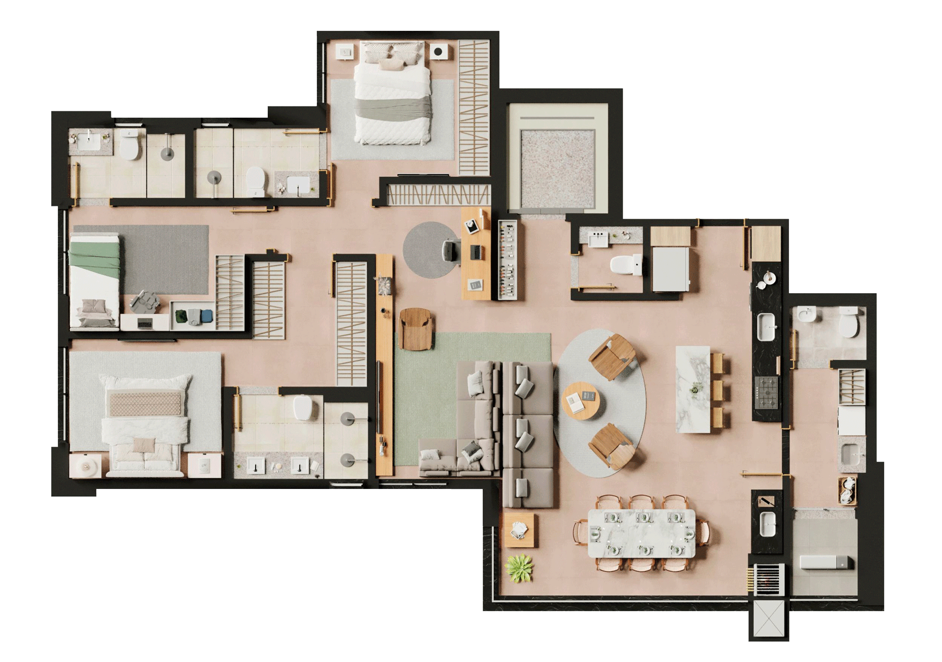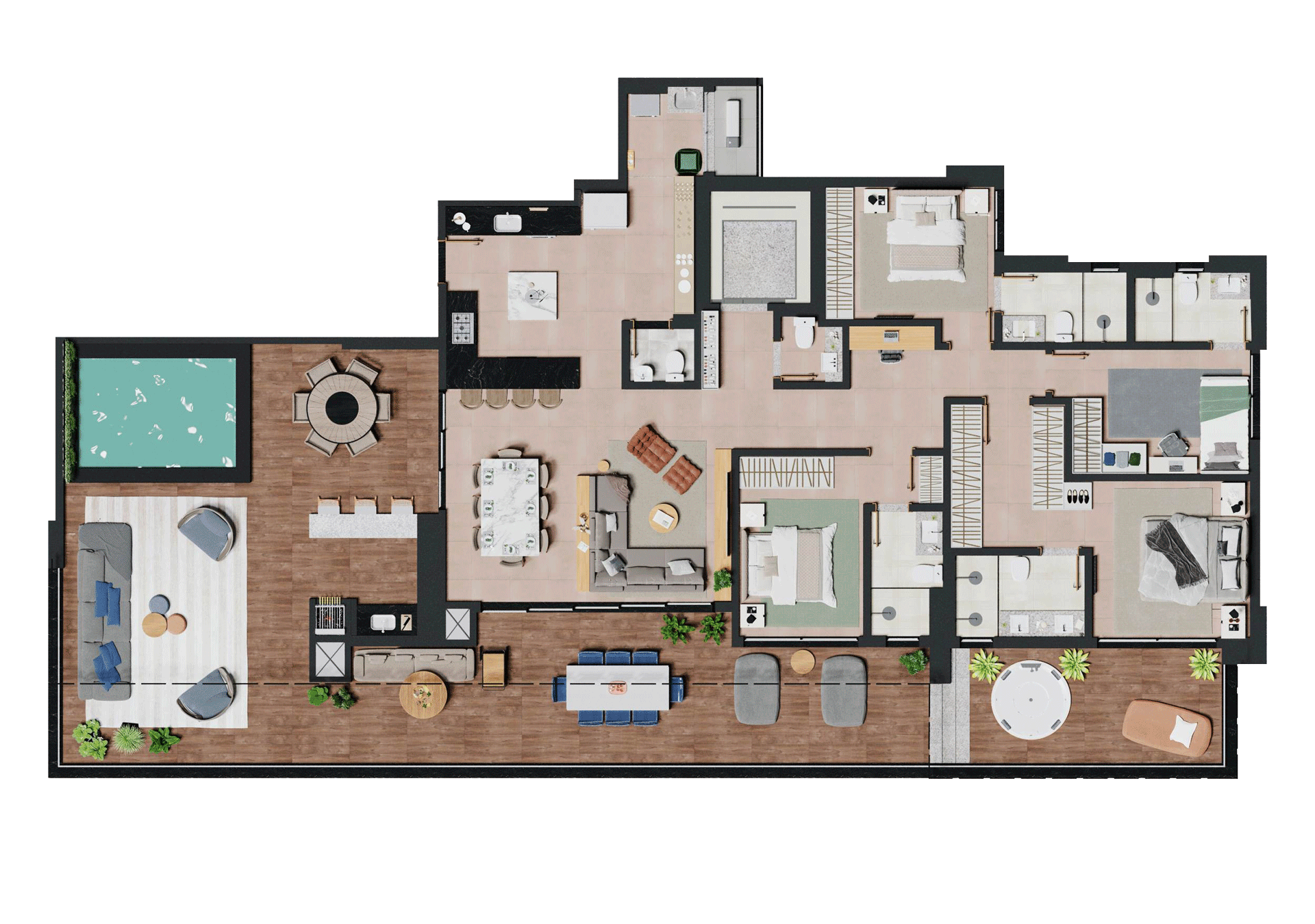 OS ELEMENTOS SE INTEGRAM E COMPÕEM A QUALIDADE E A EXCLUSIVIDADE DE UMA RESERVA EM MEIO AO BUENO. 800 M² DE ÁREA VERDE E UM LAZER TROPICAL EXCLUSIVO COM MAIS DE 2.230 M².