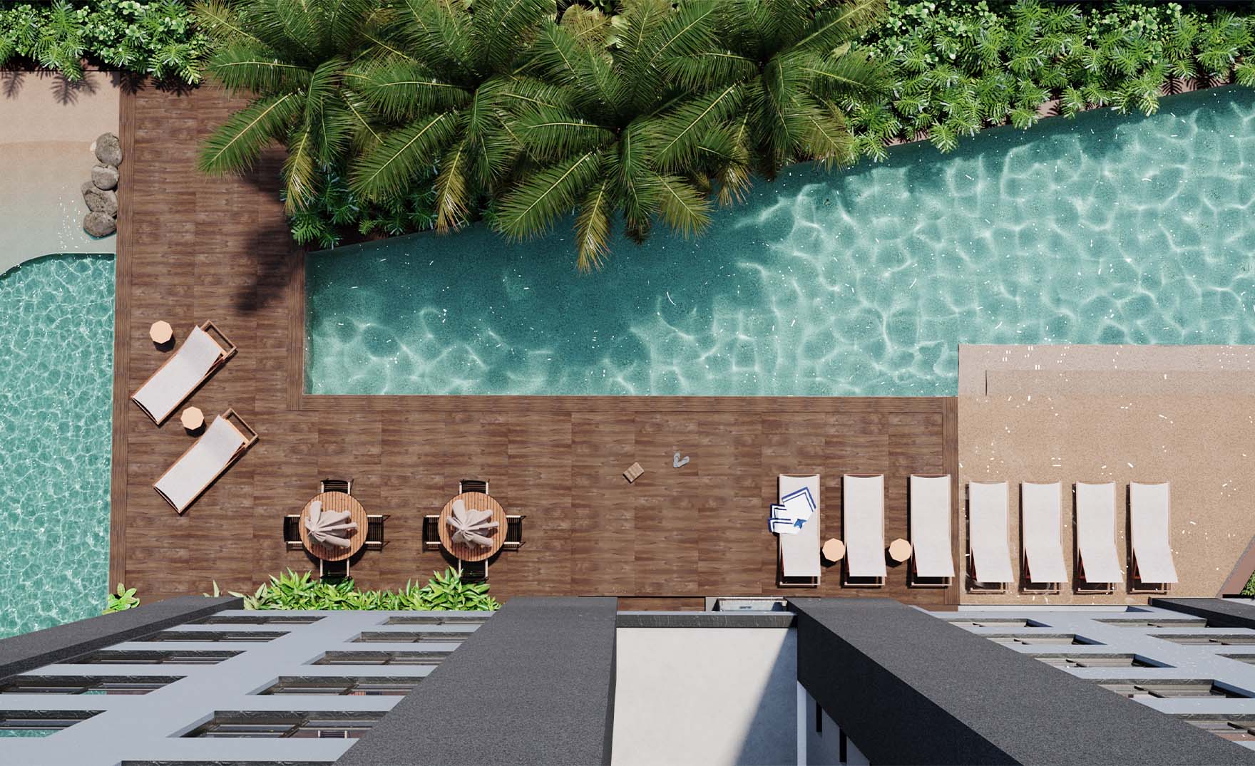 OS ELEMENTOS SE INTEGRAM E COMPÕEM A QUALIDADE E A EXCLUSIVIDADE DE UMA RESERVA EM MEIO AO BUENO. 800 M² DE ÁREA VERDE E UM LAZER TROPICAL EXCLUSIVO COM MAIS DE 2.230 M².